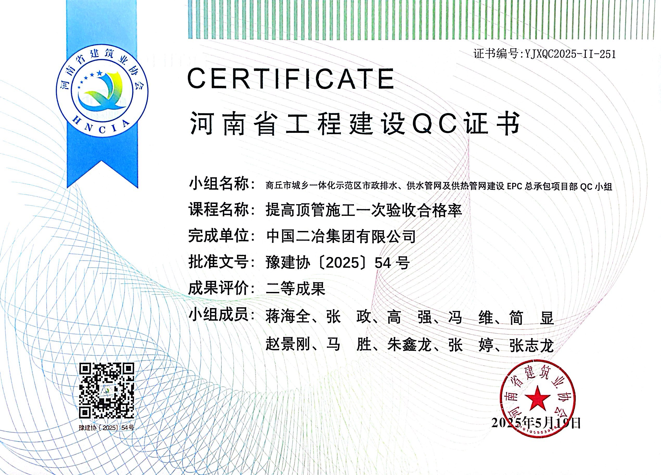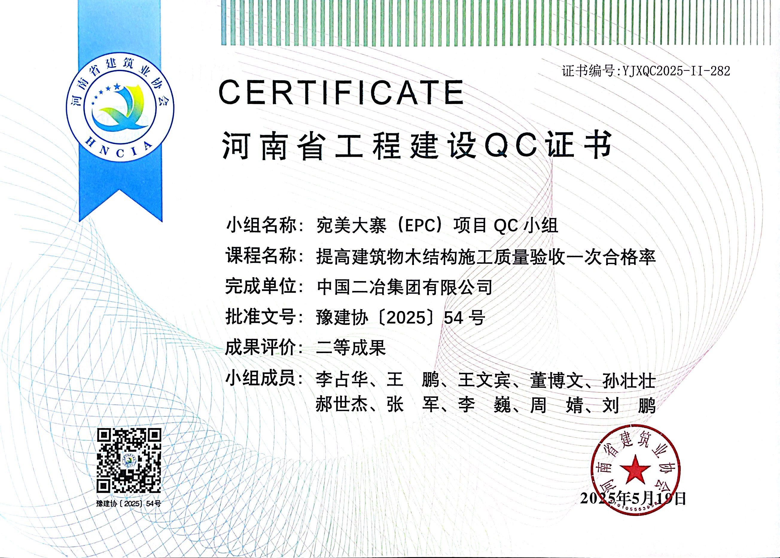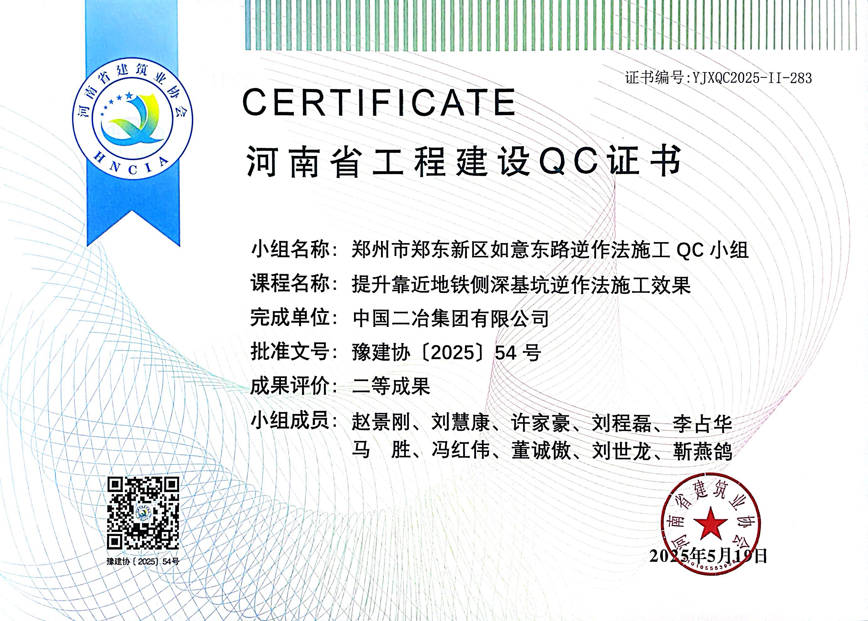 近日,省建協公布了2025年河南省工程建設質量管理小組活動成果評價(QC評價)結果,中國二冶集團中原分公司申報的《提高頂管施工一次驗收合格率》《提升靠近地鐵側深基坑逆作法施工效果》《提高建筑物木結構施工質量驗收一次合格率》榮獲二等成果評價。