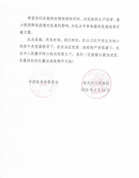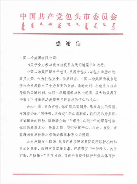 3月2日,中國二冶收到包頭市委、市政府發(fā)來的感謝信,感謝中國二冶在包頭市抗擊疫情的關(guān)鍵時(shí)刻,主動請纓,與包頭全體市民風(fēng)雨同舟、患難與共,為打贏這場疫情防控殲滅戰(zhàn)貢獻(xiàn)央企力量。