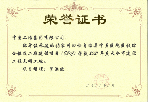 3月20日,中國二冶張家川縣中醫醫院遷建工程項目部收到甘肅省天水市2021年度建設工程文明工地榮譽證書。
