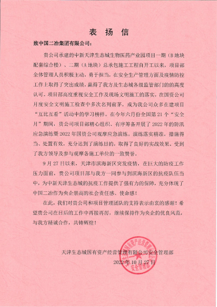 中國二冶天津生態城項目部收到國資公司安全管理部感謝信