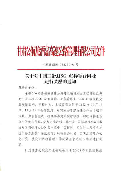 中國二冶酒嘉項目獲甘肅公航旅酒嘉高速公路管理有限公司通報表揚