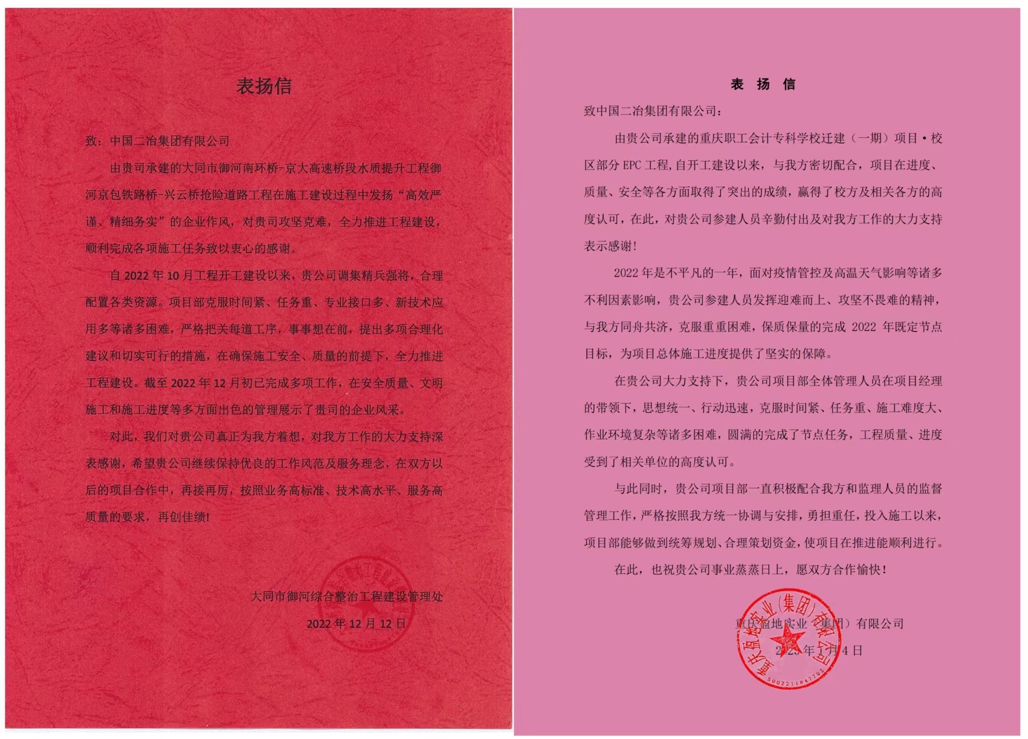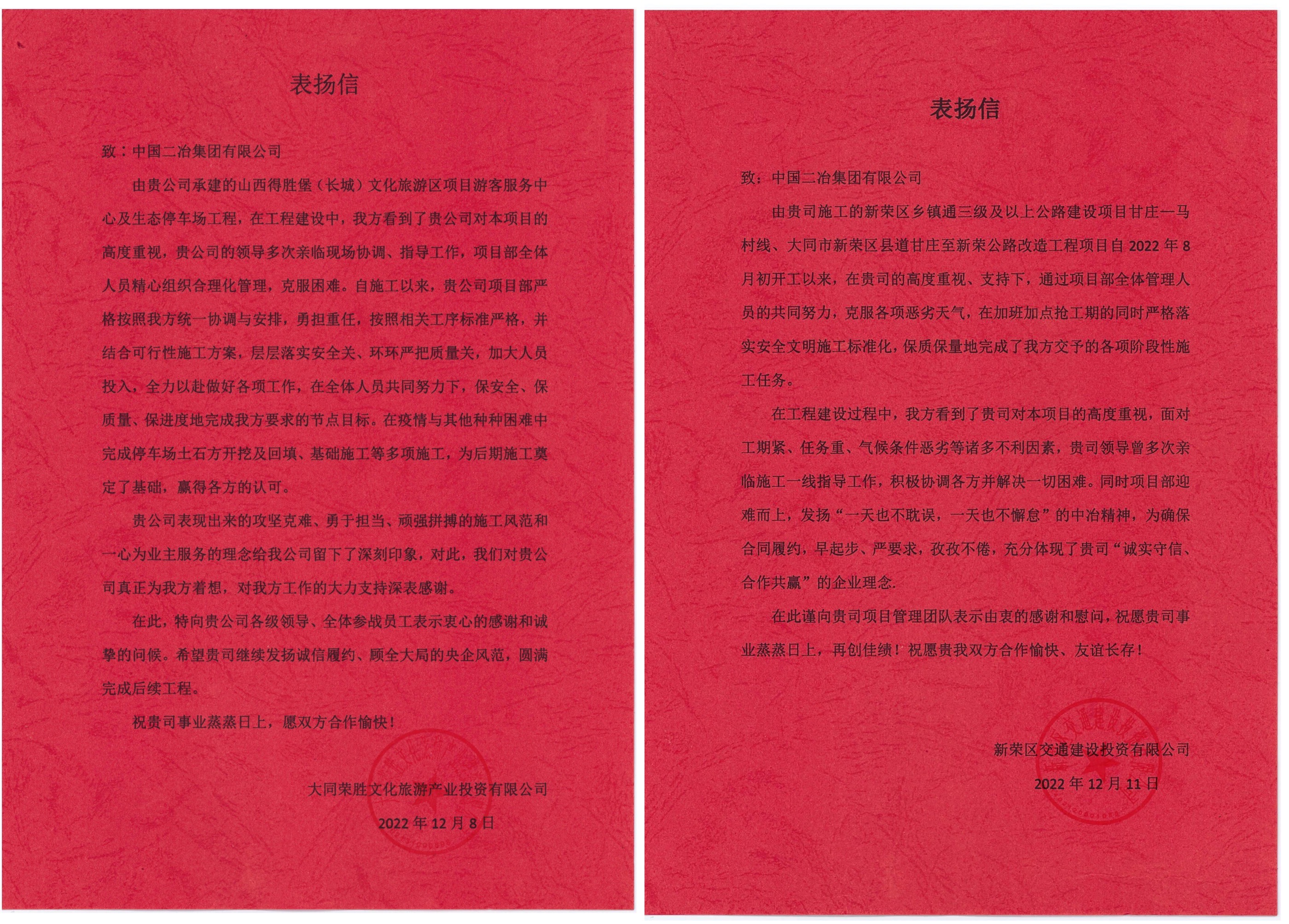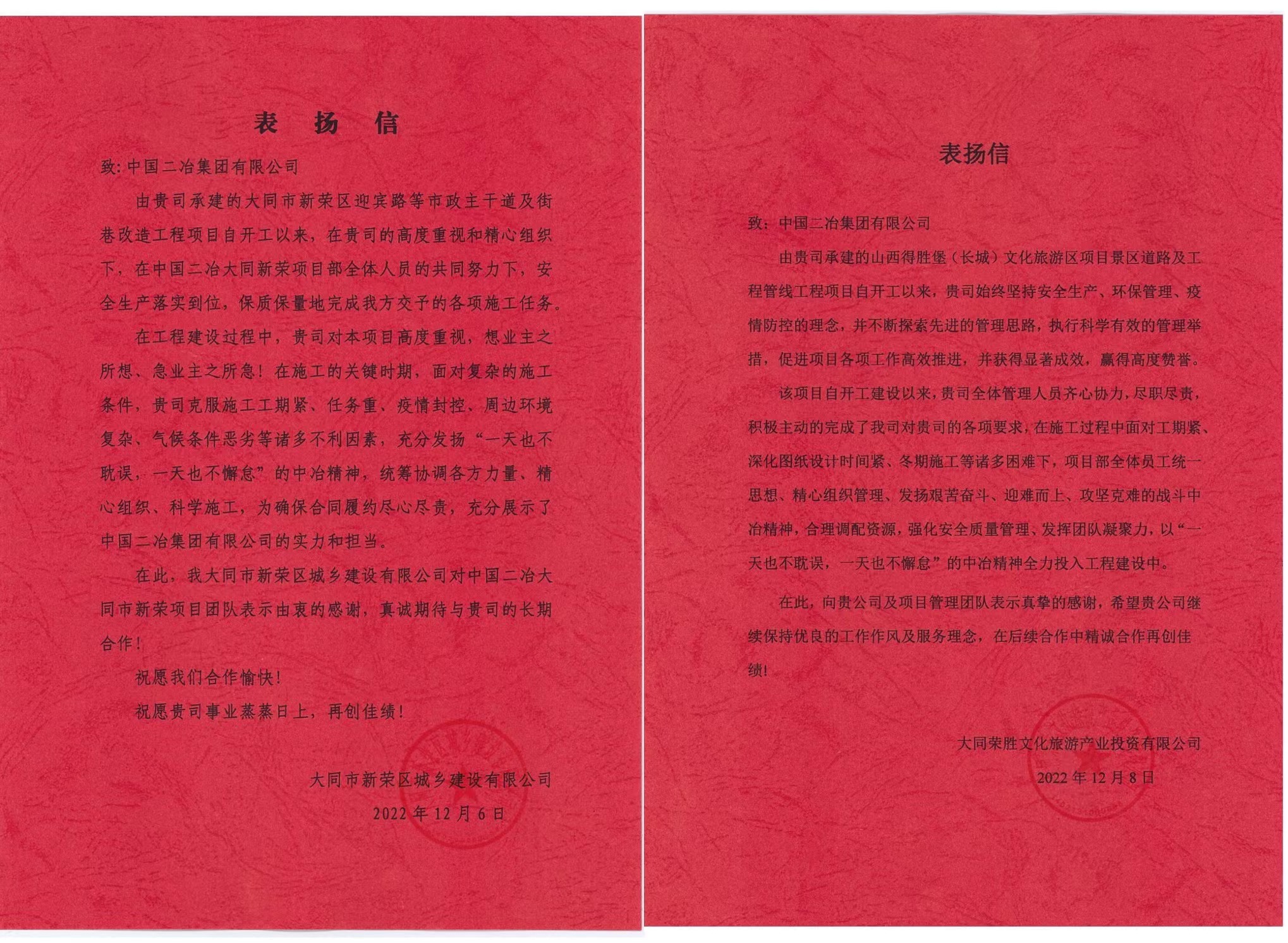 歲末年初,中國二冶各項目部陸續收到所承建的大同市新榮區迎賓路等市政工程項目、山西得勝堡游客服務中心及生態停車場工程項目、大同市新榮區新甘馬三級公路項目、山西得勝堡得勝廣場景區道路及工程管線工程項目、大同市御河搶險道路工程項目、重慶職工會計專科學校遷建(一期)項目以及金盛快速路北段——杭蓋路連接線項目共計七個項目業主單位的表揚信。
