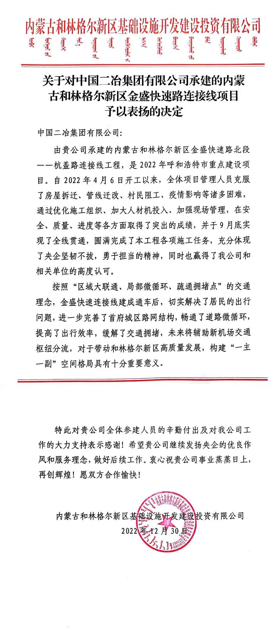 金盛快速路北段——杭蓋路連接線項目收到和林格爾新區基建公司表揚信。信中寫到,金盛快速路連接線項目是2022年呼和浩特市重點建設項目。自2022年4月6日開工以來,全體項目管理人員克服了房屋拆遷、管線遷改、疫情影響等諸多困難,通過優化施工組織,加大人材機投入,加強現場管理,在安全、質量、進度等各方面取得了突出的成績,并于9月底實現了全線貫通,圓滿完成了本工程各項施工任務。同時,也贏得了我公司和相關單位的高度認可。