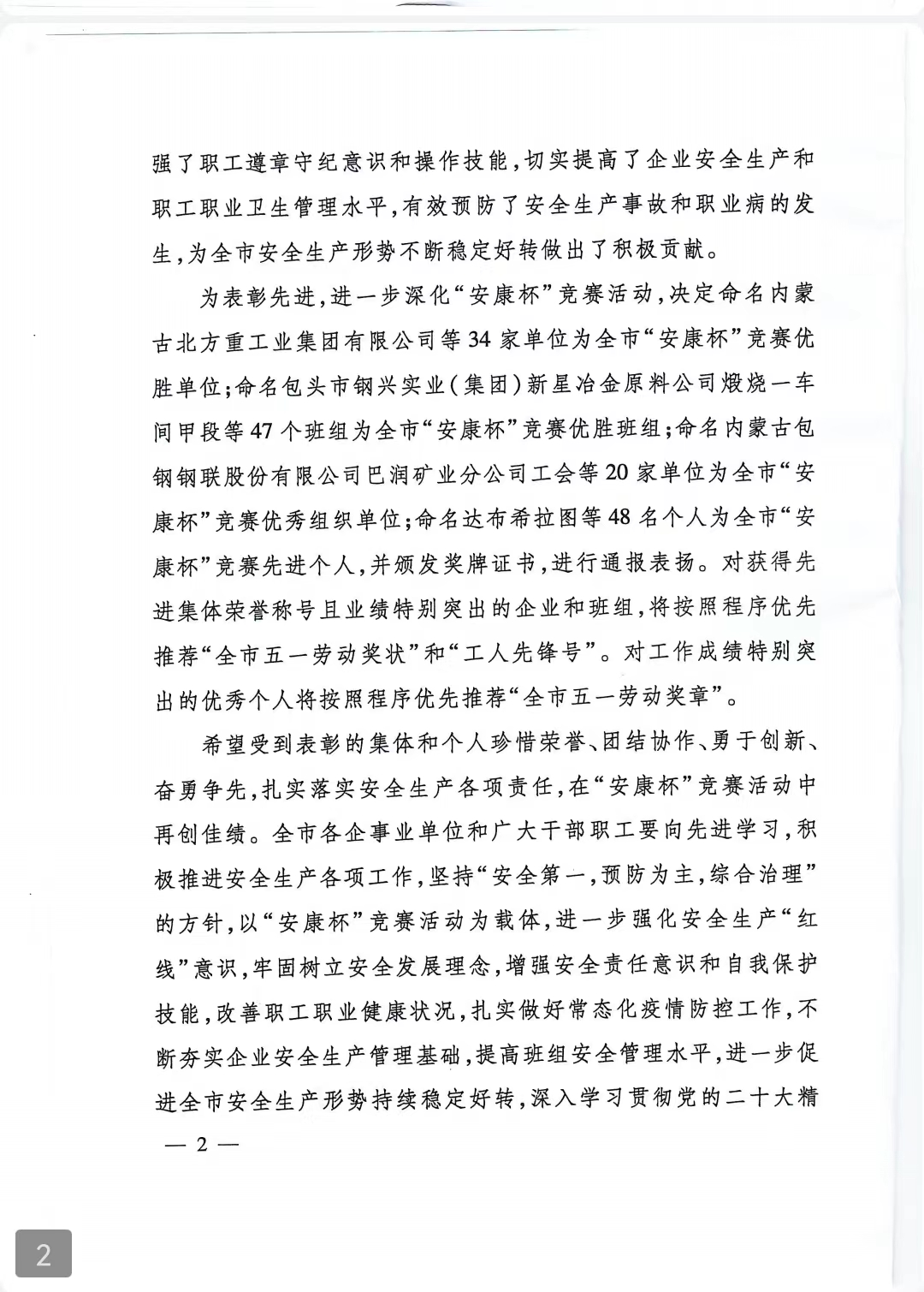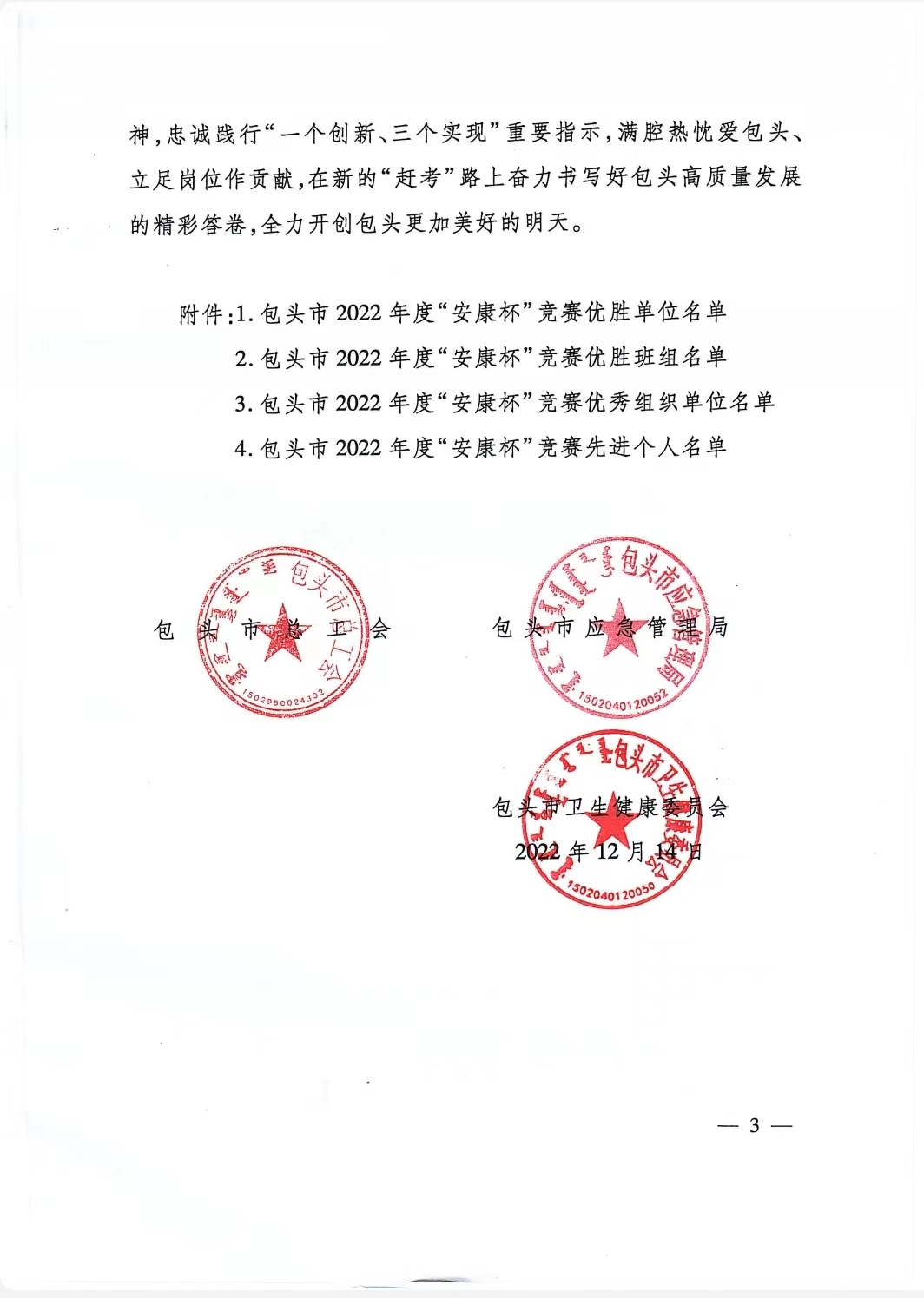 “安康杯”競賽活動是由包頭市總工會和包頭市應(yīng)急管理部及包頭市衛(wèi)生健康委員會聯(lián)合組織的安全生產(chǎn)競賽評比活動,旨在通過競賽安全生產(chǎn)管理、領(lǐng)導(dǎo)者安全生產(chǎn)意識、職工安全生產(chǎn)知識水平和能力、安全生產(chǎn)各項指標(biāo)評比,不斷推動企事業(yè)單位的安全生產(chǎn)工作和安全文化建設(shè),不斷擴(kuò)大社會影響,提高全民安全生產(chǎn)意識,最終降低各類事故的發(fā)生率和各類職業(yè)病的發(fā)病率。