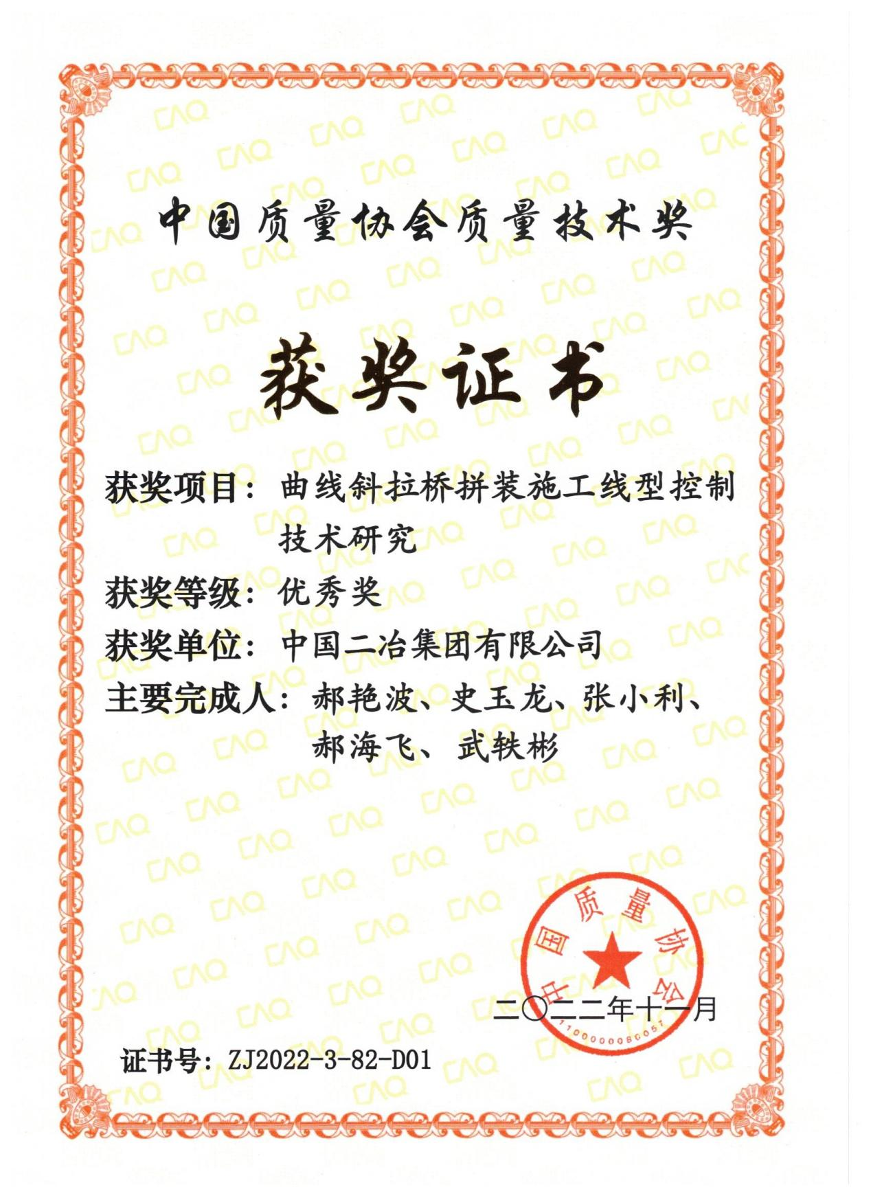 精益求精,鑄就品質(zhì)典范。2月9日,中國(guó)二冶收到中國(guó)質(zhì)量協(xié)會(huì)頒發(fā)的證書,由公司申報(bào)的“曲線斜拉橋拼裝施工線型控制技術(shù)研究”榮獲2022年度中國(guó)質(zhì)量協(xié)會(huì)質(zhì)量技術(shù)進(jìn)步優(yōu)秀獎(jiǎng)。