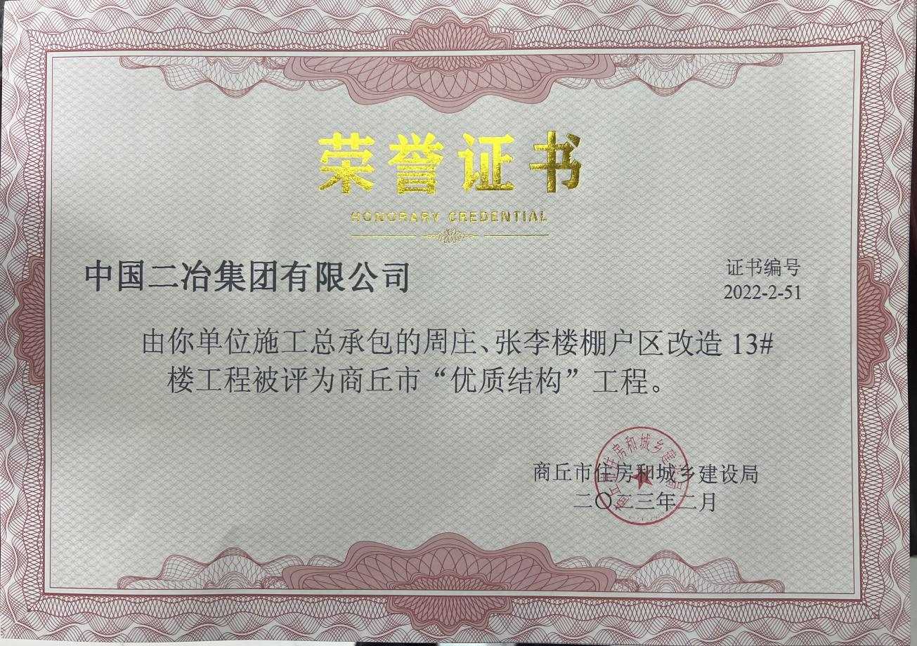 2月10日,由中國(guó)二冶承建的虞城周莊、張立樓棚戶區(qū)改造13#樓工程榮獲河南省商丘市住房和城鄉(xiāng)建設(shè)局頒發(fā)的2022年度“優(yōu)質(zhì)結(jié)構(gòu)工程獎(jiǎng)”。