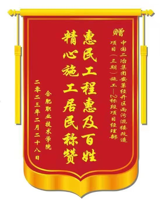3月12日,合肥職業技術學院副院長一行四人為中國二冶安巢經開區雨污混接改造項目送來錦旗,對項目部攻克重重難關,圓滿完成學院雨污管道的改造任務,為學院校慶工作順利進行提供保證,同時對施工中彰顯出的社會責任與擔當給予肯定和贊揚。