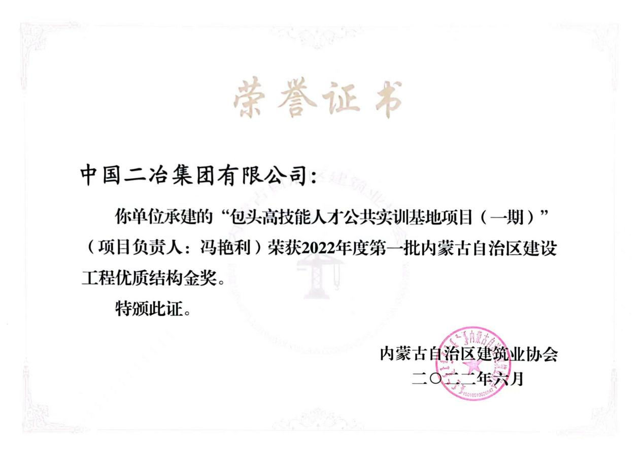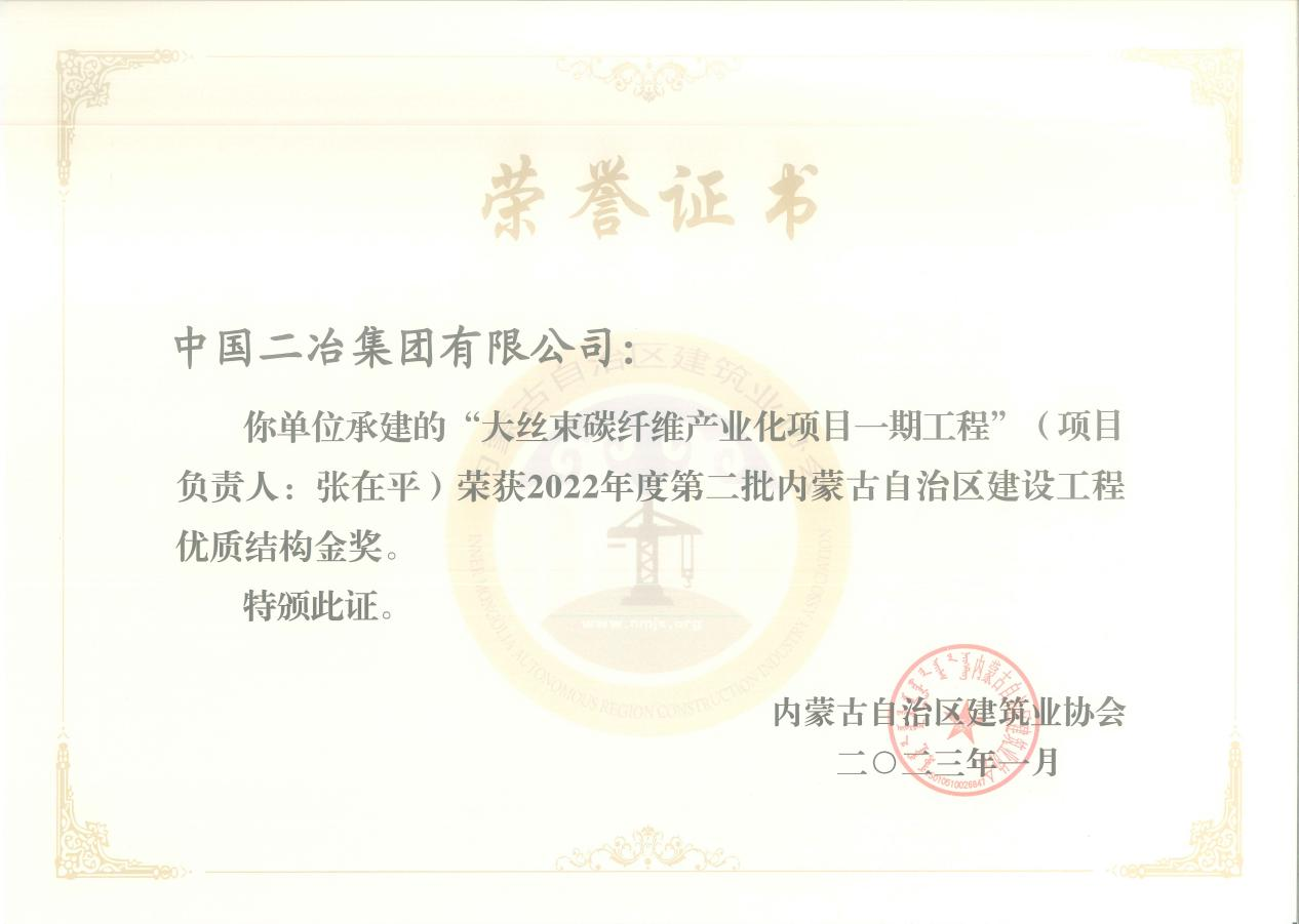 3月29日,中國二冶收到內蒙古自治區(qū)建筑業(yè)協會榮譽證書,公司五個項目榮獲2022年度內蒙古自治區(qū)建設工程優(yōu)質結構金獎、銀獎。實訓基地項目和大絲束碳纖維產業(yè)化項目一期工程分別獲得2022年度第一批和第二批內蒙古自治區(qū)建設工程優(yōu)質結構金獎;水泊東岸項目、包頭市九原醫(yī)院項目、中冶德賢公館項目獲2022年度第二批內蒙古自治區(qū)建設工程優(yōu)質結構銀獎。