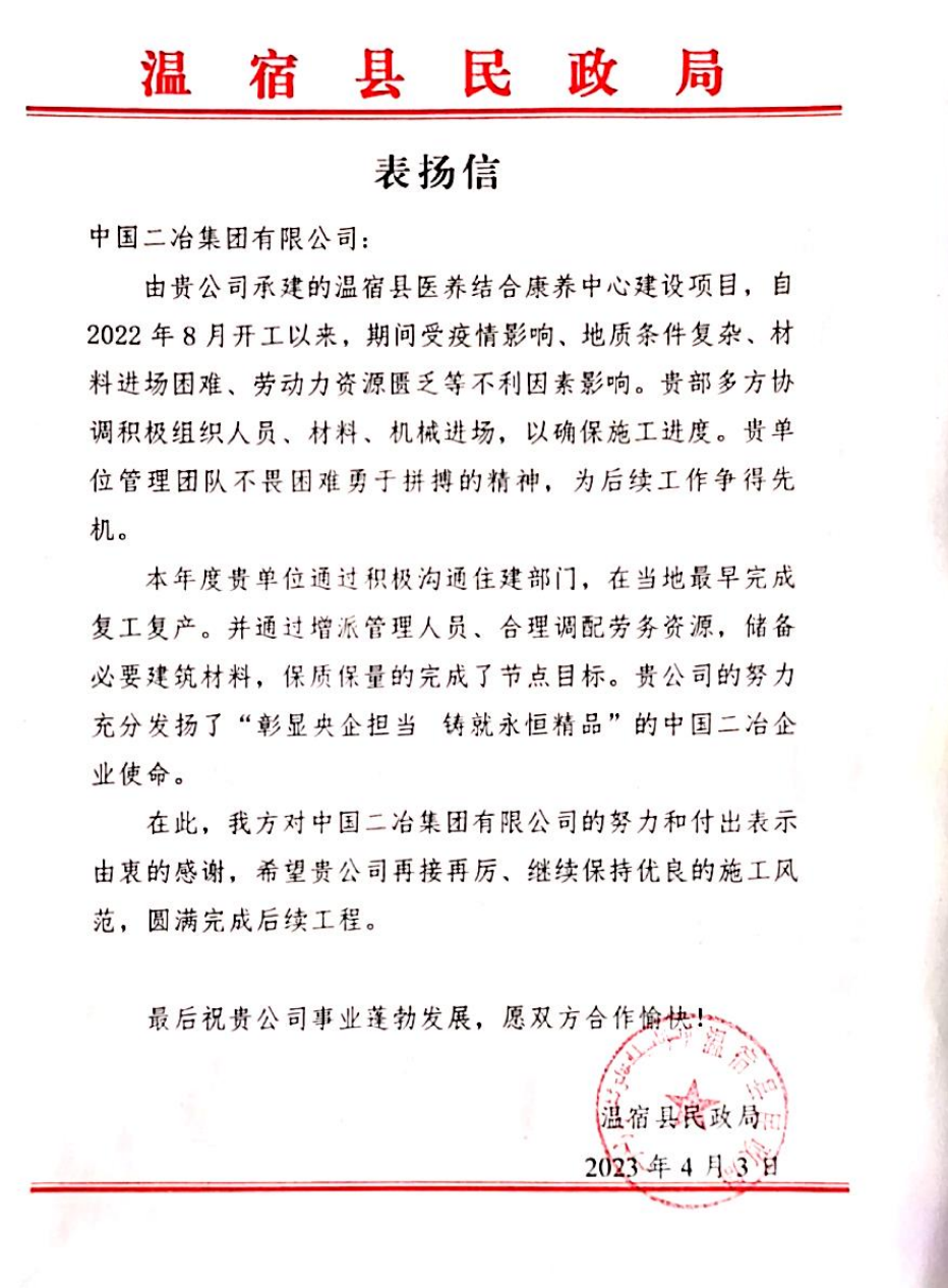 4月11日,中國二冶收到新疆阿克蘇地區溫宿縣民政局表揚信,對溫宿縣醫養結合康養中心建設項目在施工過程中高效率、高質量完成節點目標表示高度肯定,對溫宿項目建設過程中不畏困難勇于拼搏的精神進行贊揚。
