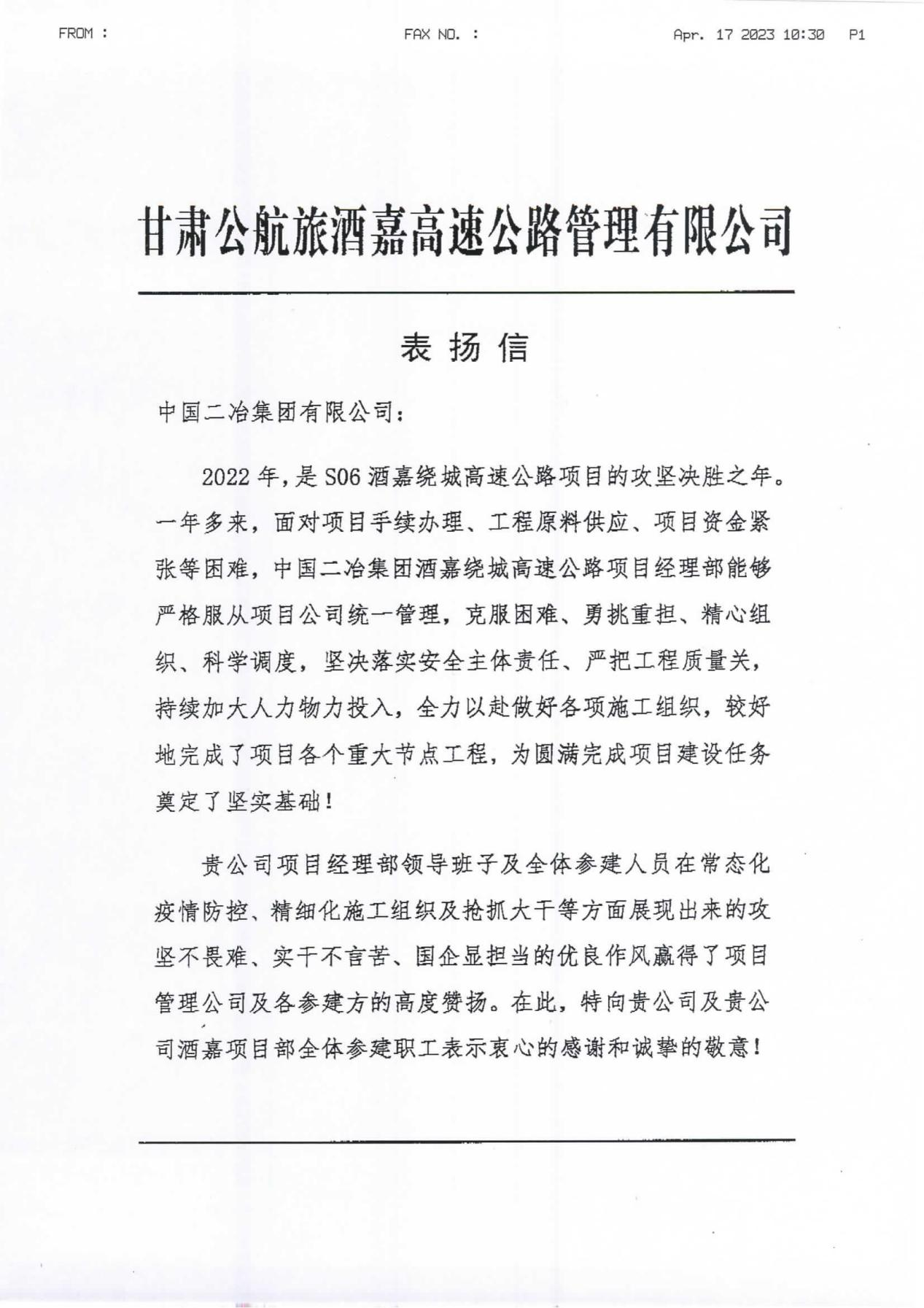 4月17日,中國(guó)二冶收到甘肅公航旅酒嘉高速公路管理有限公司表?yè)P(yáng)信,對(duì)中國(guó)二冶酒嘉繞城高速公路項(xiàng)目部精細(xì)化施工組織及搶抓大干等方面展現(xiàn)出來(lái)的攻堅(jiān)不畏難、實(shí)干不言苦、國(guó)企顯擔(dān)當(dāng)?shù)膬?yōu)良作風(fēng)進(jìn)行高度贊揚(yáng)。