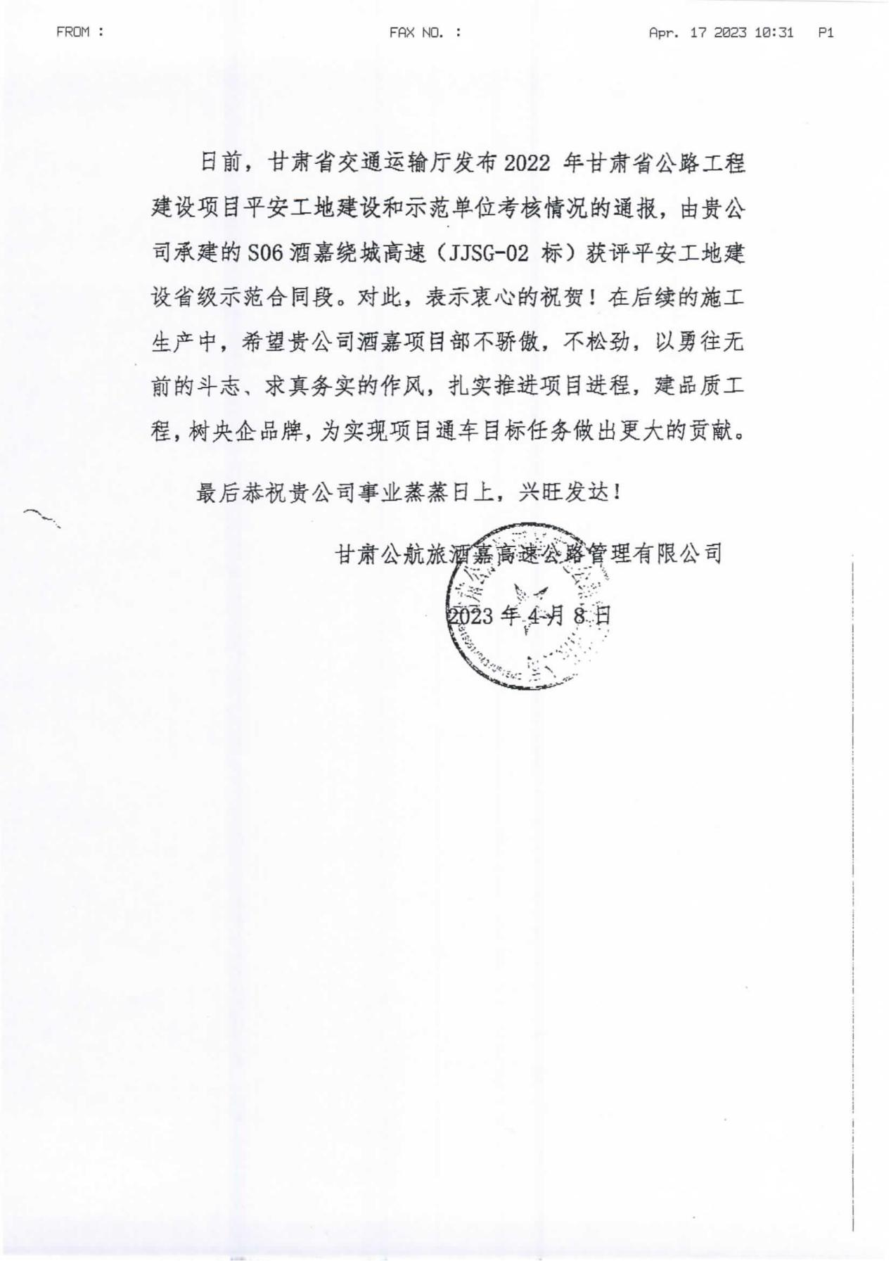 表?yè)P(yáng)信指出,2022年,是酒嘉繞城高速公路項(xiàng)目的攻堅(jiān)決勝之年,酒嘉繞城高速公路項(xiàng)目部能夠嚴(yán)格服從項(xiàng)目公司統(tǒng)一管理,克服困難、勇挑重?fù)?dān)、精心組織、科學(xué)調(diào)度,堅(jiān)決落實(shí)安全主體責(zé)任、嚴(yán)把工程質(zhì)量關(guān),持續(xù)加大人力物力投入,全力以赴做好各項(xiàng)施工組織,較好地完成了項(xiàng)目各個(gè)重大節(jié)點(diǎn)工程,為圓滿完成項(xiàng)目建設(shè)任務(wù)奠定了堅(jiān)實(shí)基礎(chǔ)!