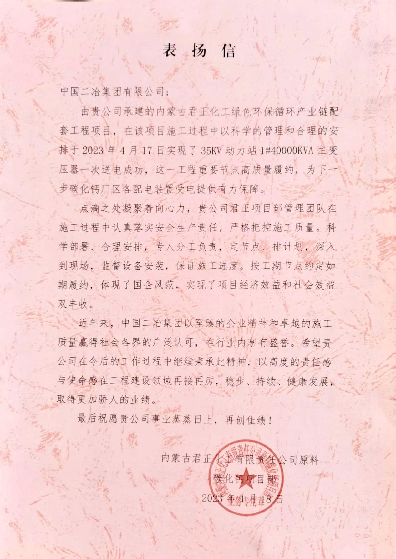 表?yè)P(yáng)信中指出,君正項(xiàng)目在施工過(guò)程中以科學(xué)的管理和合理的安排于2023年4月17日實(shí)現(xiàn)了35KV動(dòng)力站1#40000KVA主變壓器一次送電成功,該重要節(jié)點(diǎn)的高質(zhì)量履約,為下一步碳化鈣廠區(qū)各配電裝置受電提供了有力保障。