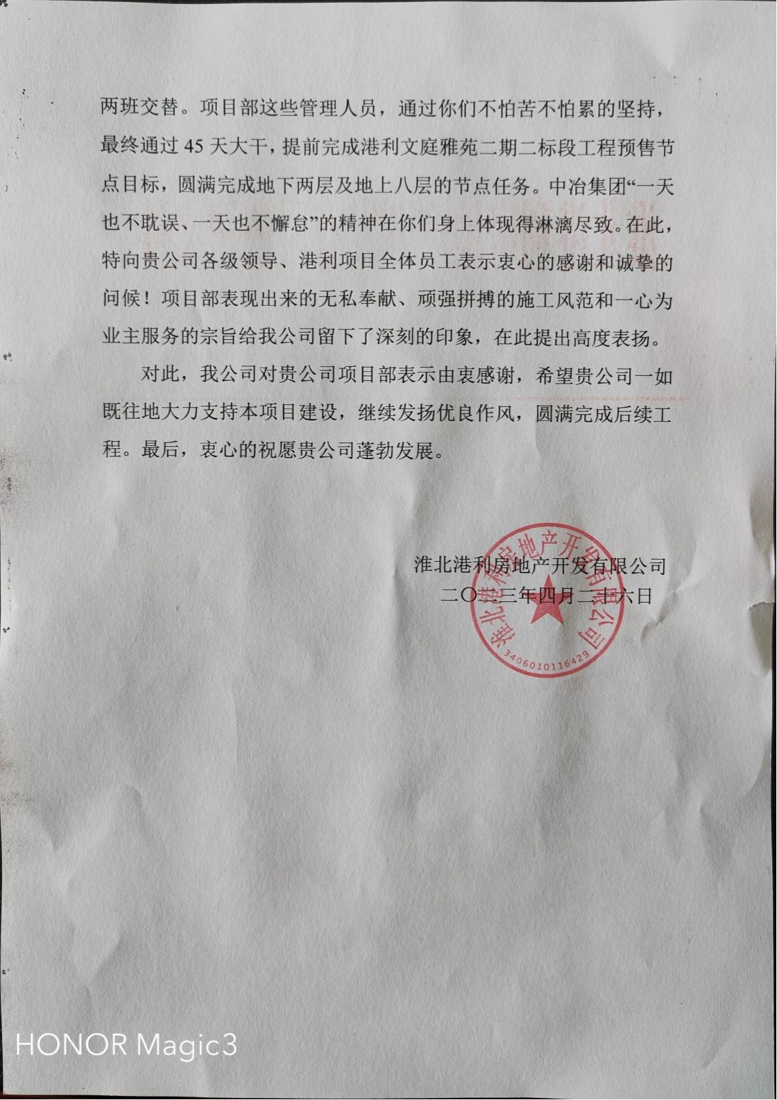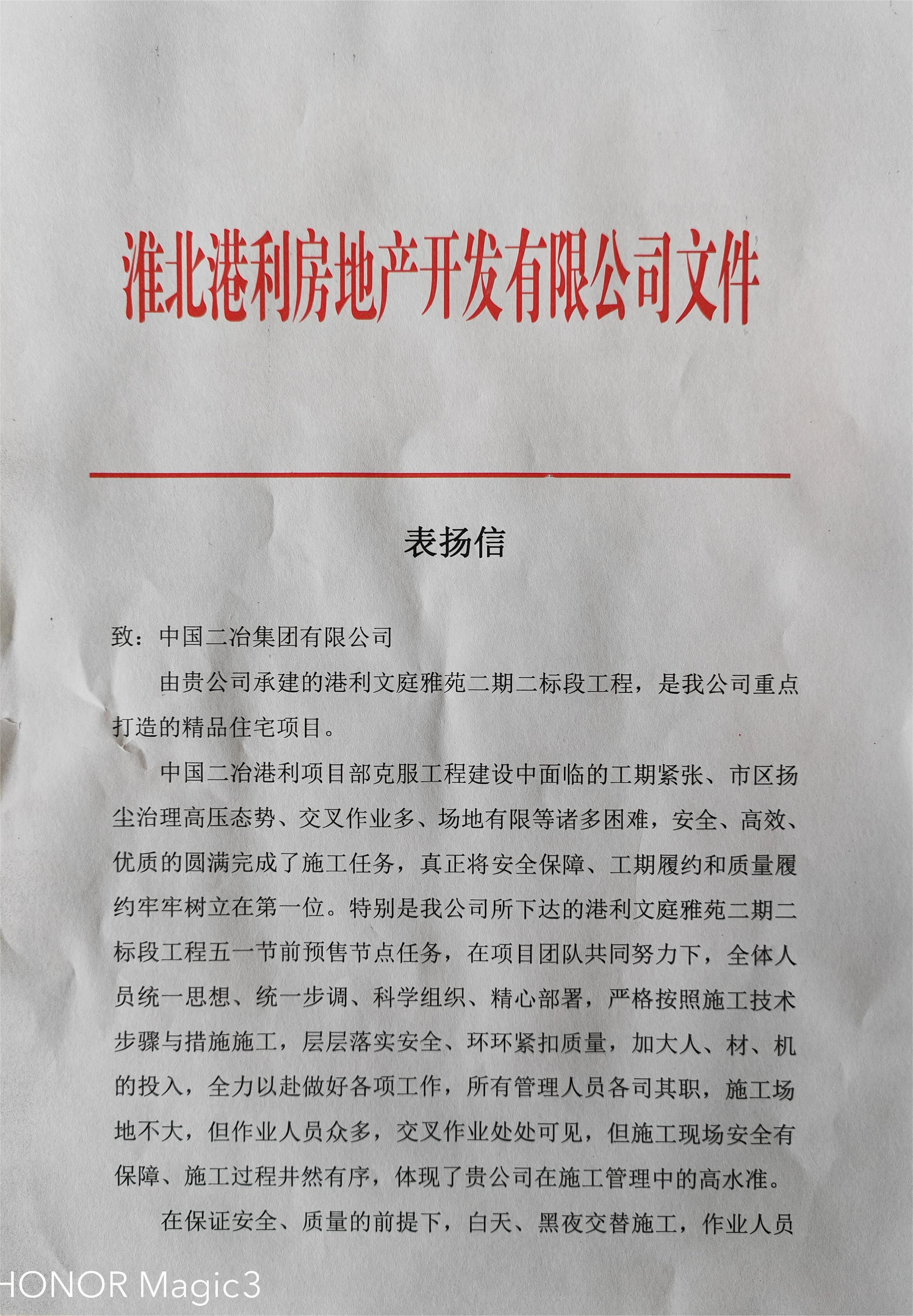 4月26日,中國二冶華東分公司承建的港利文庭雅苑項目收到業主方淮北港利房地產開發有限公司的表揚信,對華東分公司港利文庭雅苑項目部克服工程建設中面臨的工期緊張、市區揚塵治理高壓態勢、交叉作業多、場地有限等諸多困難,安全、高效、優質完成施工任務表示贊許。