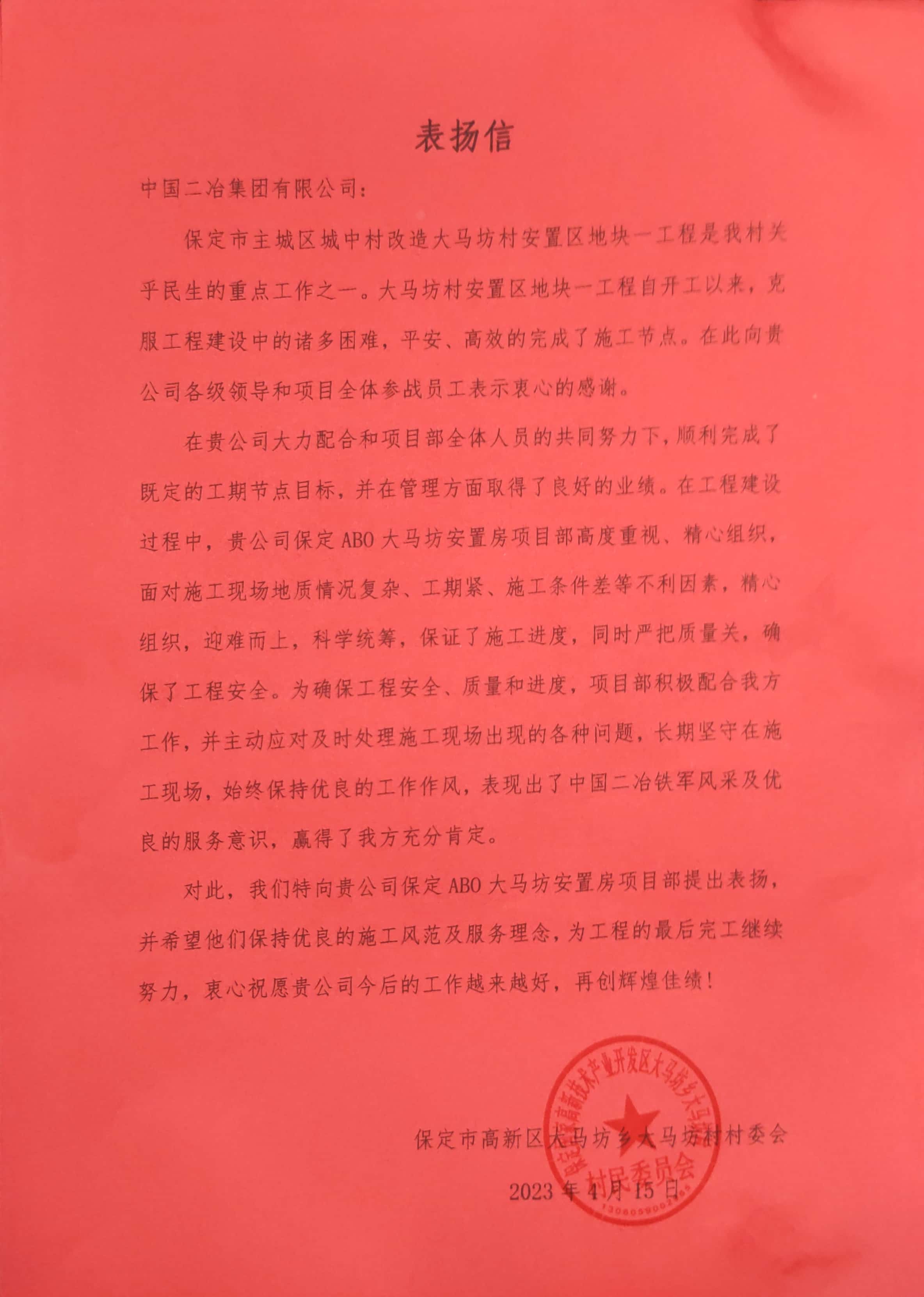 信中寫道,對中國二冶保定ABO二期大馬坊項目部全體員工充分發揮“一天也不耽誤,一天也不懈怠”的企業精神,夜以繼日搶抓工期的施工現場體現出的“二冶速度”表示高度贊揚。該項目部為切實保證工期,克服了重重困難,精心組織、迎難而上,保證了施工進度,同時嚴把質量關,確保工程安全有序推進。同時,信中表示大馬坊鄉老百姓對該項目部在近期組織的精裝修樣板工程觀摩活動,給予了一致好評。