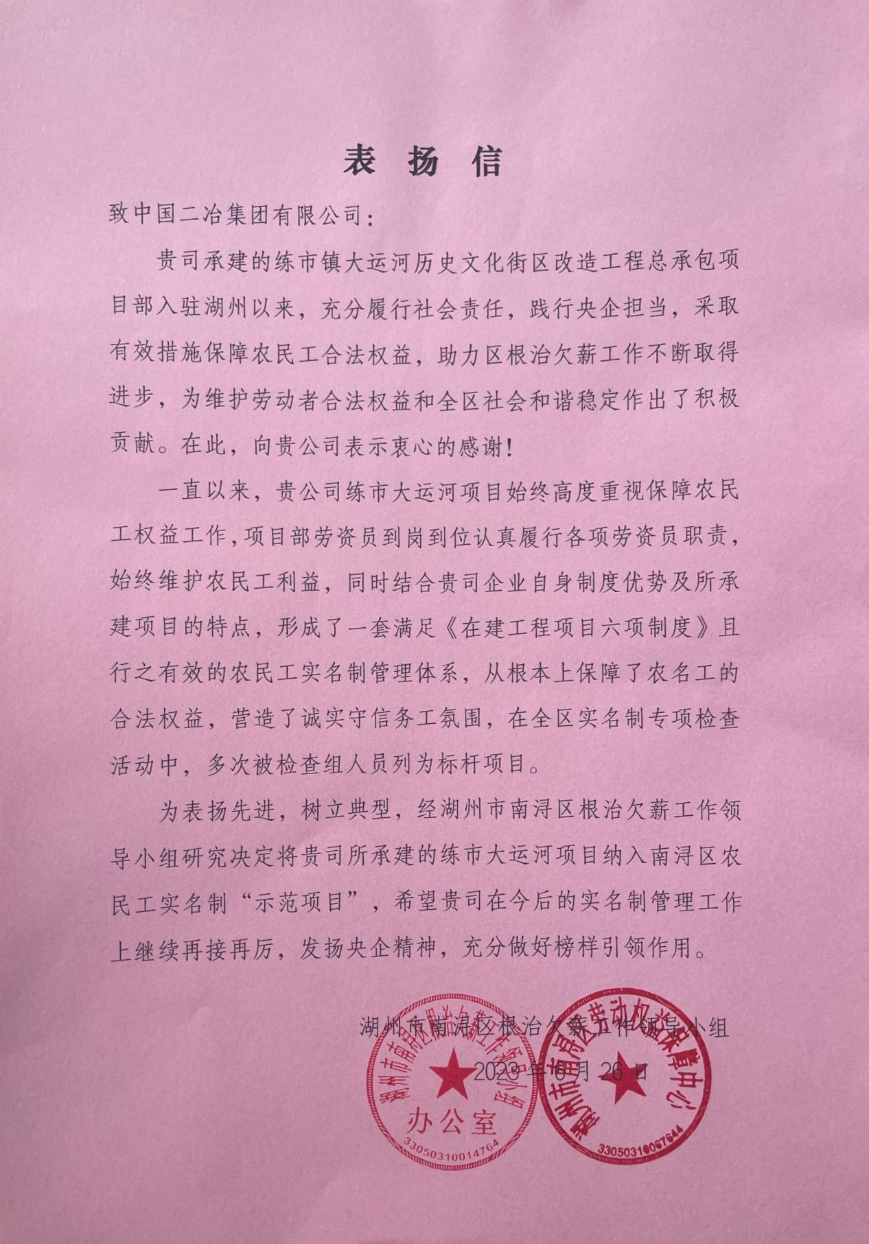 6月28日,中國(guó)二冶練市鎮(zhèn)大運(yùn)河歷史文化街區(qū)改造工程項(xiàng)目部收到湖州市南潯區(qū)根治欠薪工作領(lǐng)導(dǎo)小組的感謝信。信中對(duì)中國(guó)二冶堅(jiān)決維護(hù)勞動(dòng)者合法權(quán)益的決心和為社會(huì)和諧作出的貢獻(xiàn)表示贊揚(yáng)。
