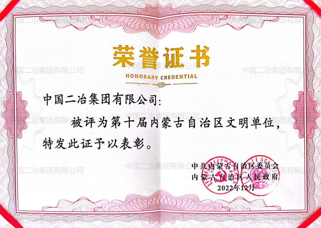 2023年,中國二冶順利通過內蒙古自治區文明單位審核,7月收到由中共內蒙古自治區委員會、內蒙古自治區人民政府頒發的“內蒙古自治區文明單位”獎牌和證書。這是中國二冶精神文明建設的一枚勛章,也為企業高質量健康發展再添不竭動力。