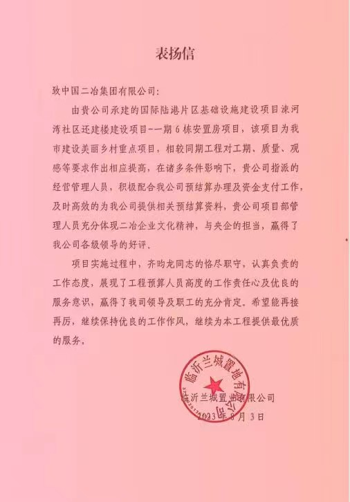 8月6日,中國二冶收到臨沂蘭城置業有限公司表揚信,對國際陸港片區基礎設施建設項目——涑河灣社區還建樓建設的快速推進表示贊許。