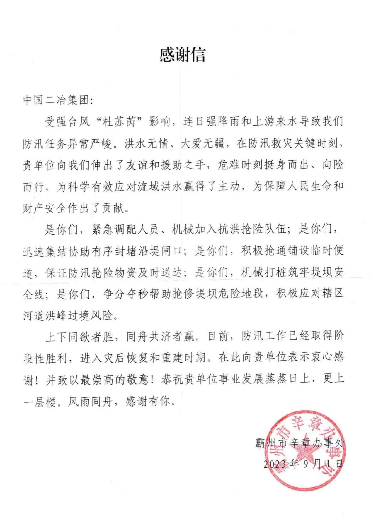 9月15日,中國二冶收到霸州市辛章辦事處感謝信,對中國二冶在霸州市防汛救災關鍵時刻,全力以赴參與防汛搶險工作表示衷心的感謝。