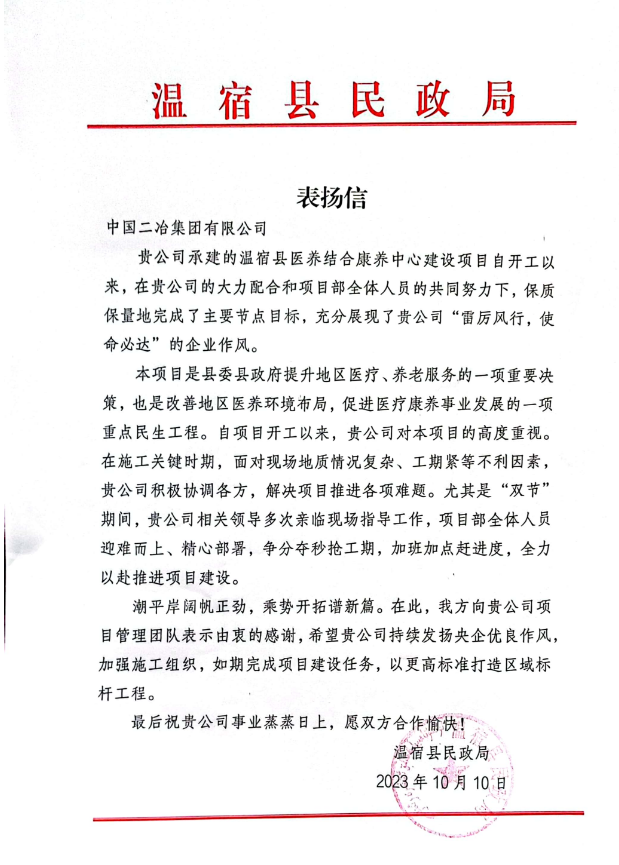 表揚信指出,溫宿項目是縣委縣政府提升地區(qū)醫(yī)療、養(yǎng)老服務(wù)的一項重要決策,也是改善地區(qū)醫(yī)養(yǎng)環(huán)境布局,促進醫(yī)療康養(yǎng)事業(yè)發(fā)展的一項重點民生工程。自項目開工以來,面對現(xiàn)場地質(zhì)情況復(fù)雜、工期緊等不利因素,溫宿項目部積極協(xié)調(diào)各方,解決項目推進各項難題。尤其是“雙節(jié)”期間,相關(guān)領(lǐng)導(dǎo)多次親臨現(xiàn)場指導(dǎo)工作,項目部全體人員迎難而上、精心部署,爭分奪秒搶工期,加班加點趕進度,全力以赴推進項目建設(shè)。同時,在中國二冶的大力配合和項目部全體人員的共同努力下,保質(zhì)保量地完成了主要節(jié)點目標(biāo),充分展現(xiàn)了中國二冶“雷厲風(fēng)行,使命必達”的企業(yè)作風(fēng)。