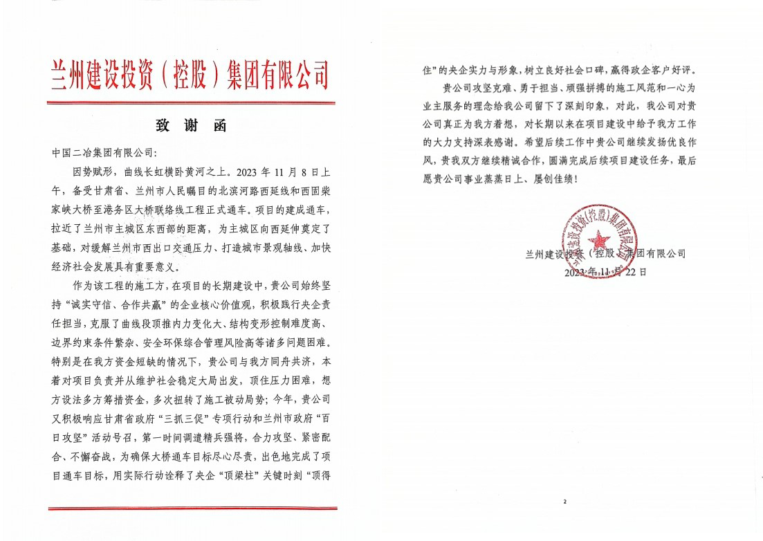 11月22日,中國二冶收到蘭州建設投資(控股)集團有限公司致謝函。
