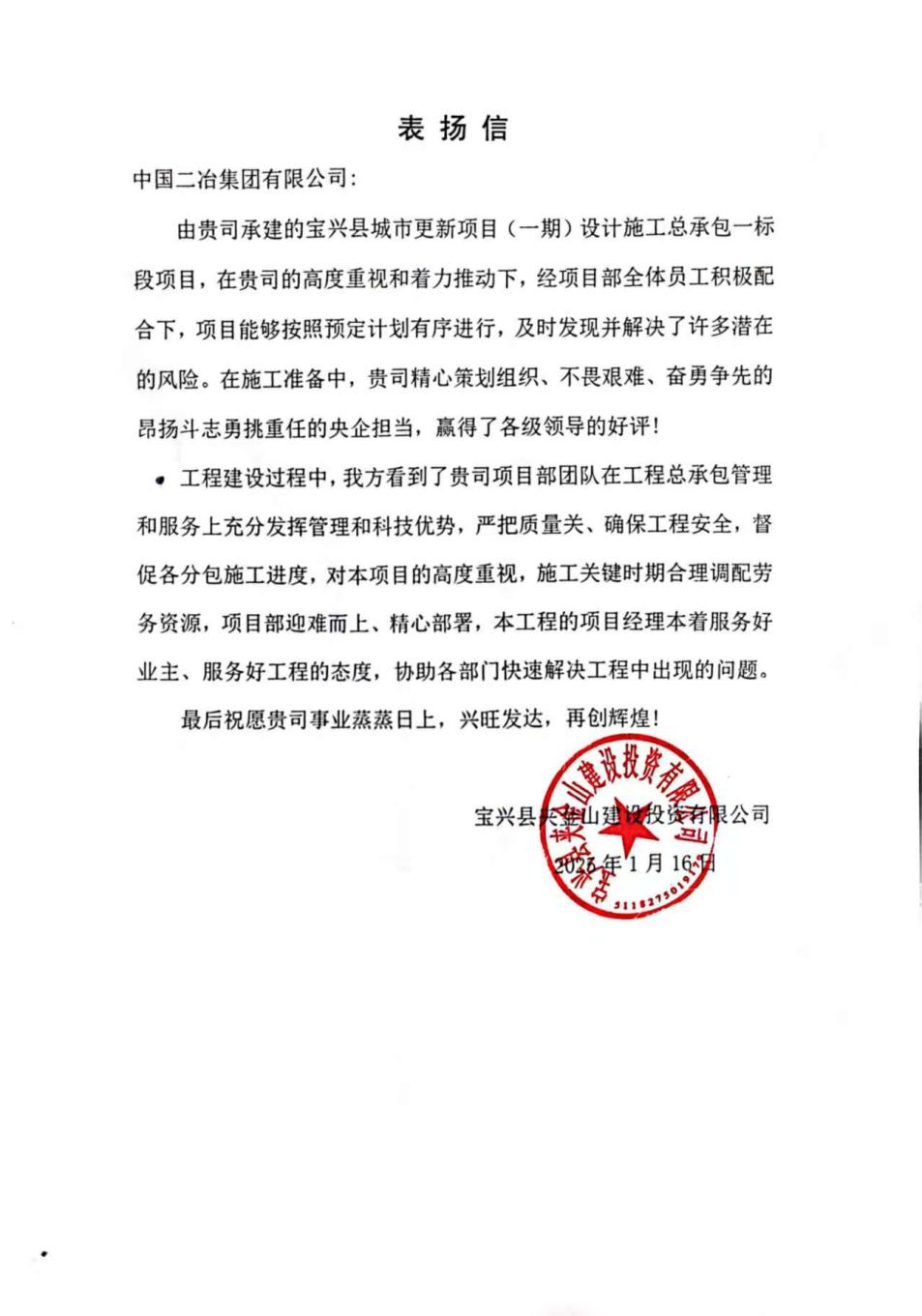 信中指出,中國二冶承建的寶興縣城市更新項(xiàng)目在工程建設(shè)過程中,項(xiàng)目管理團(tuán)隊(duì)嚴(yán)把質(zhì)量關(guān)、確保工程安全,督促各分包單位施工進(jìn)度,在施工關(guān)鍵時期合理調(diào)配勞務(wù)資源,全力推進(jìn)施工進(jìn)度,協(xié)助各部門快速解決工程中出現(xiàn)的問題,及時發(fā)現(xiàn)并解決了許多潛在的風(fēng)險(xiǎn)。