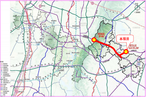 梓州大道南延線(省道424大林至仁壽段)工程位于眉山市天府新區,全長17.284km(含連接線長度)。該工程按一級公路標準雙向6車道設計(兼顧城市道路功能),路基寬48米,設計速度80km/h,共有橋梁12座,天橋7座,涵洞及通道32道,穿龍泉山脈隧道1處(4000米),互通立交1處。主要建設項目包括道路工程、橋梁工程、交安工程及相關附屬配套設施。